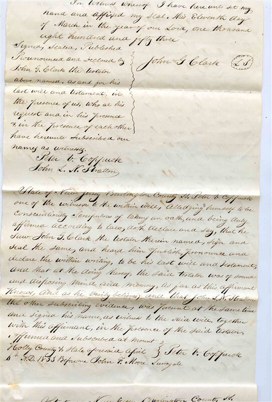 John G Clark Hand Written Sealed Will 1853 Burlington County New Jersey