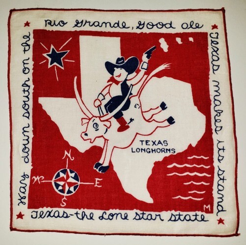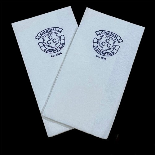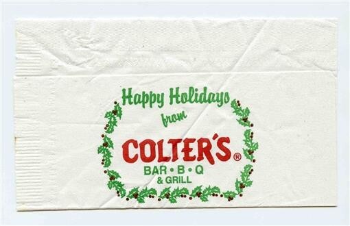 An unused folded Happy Holidays paper napkin Colter's Texas Bar B Q . Had 10 Dallas Fort Worth locations. Most of these locations are no longer open. Measures about 3 3/4" x 6 34/" when folded.
