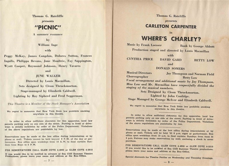 Sea Cliff Dinner Theatre Programs Summer 1955 Picnic 1956 Where's Charley