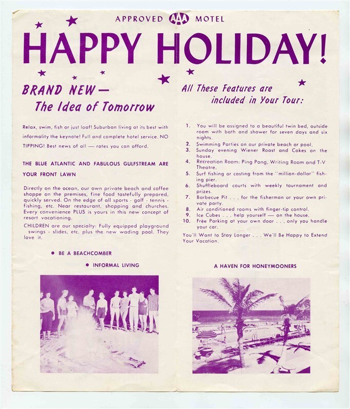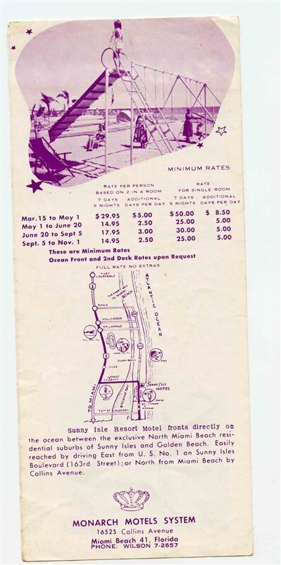 A 4 panel illustrated complete vacation brochure for the Sunny Isles Motel from the 1950's. Located at 16525 Collins Avenue in Miami Beach Florida. Has area map, rates, and more. Is in very good condition. Has photos, rates and information.