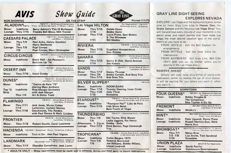 An 8 panel fold out Avis Hertz Show Guide from 1980. Includes a map of Las Vegas Nevada, a list of Airlines, Mileage Chart, sightseeing and tours. And a guide to the shows at each Las Vegas Hotel. Performers in this guide include: Paul Anka, Harry Belafonte, Jack Jones, Myron Cohen, Robert Goulet, Carol Lawrence, Goldie Hawn, Bobby Darin, Englebert Humperdinck, Don Rickles, Sonny Cher, Jim Nabors, Danny Thomas, Mel Torme and many others. Has been folded.
