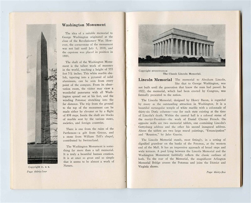 A 52 page booklet with large fold out map of Washington DC. Baltimore Ohio Railroad Pictorial Travel Guide to Washington Booklet. Published in 1958 In very fine condition . Lots of photos and information.
