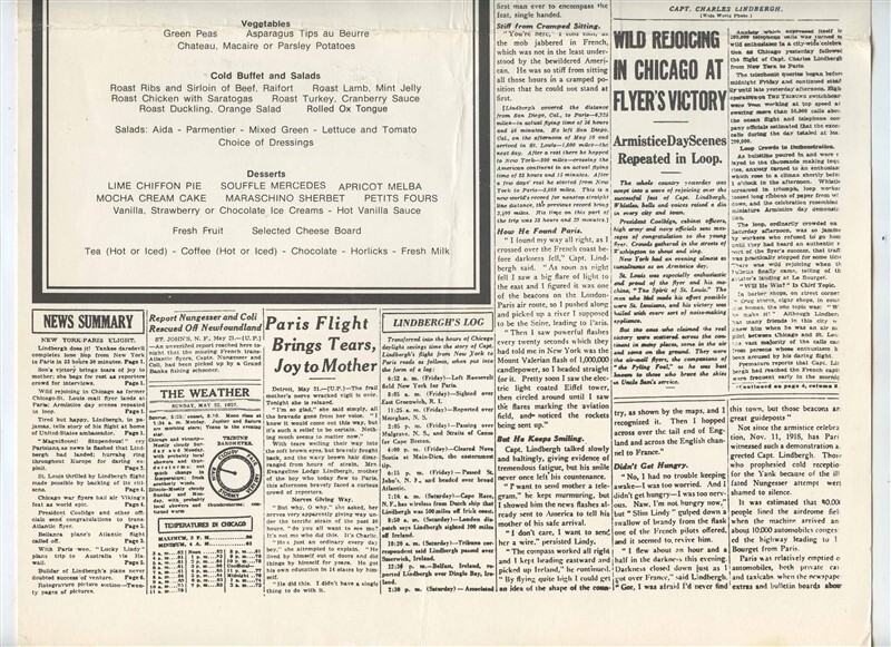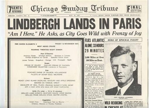 A large single page West Indies Cruise, Roaring Twenties Night Dinner on November 15, 1974. . Measures about 11 1/4" x 17" and the back is blank. Queen Elizabeth 2 Lindbergh Lands in Paris headline on a Chicago Sunday Tribune facsimile.