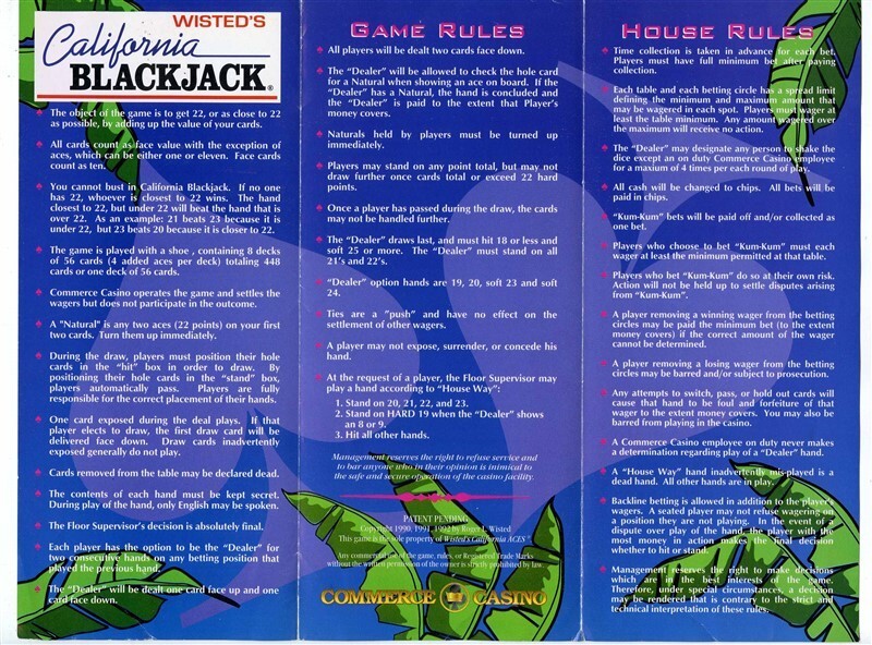 A full color 6 panel fold out brochure. Commerce Casino Wisted's California Blackjack Brochure . Commerce Casino is located in Commerce California With information, Game Rules, House Rules, Hand Rankings and more.