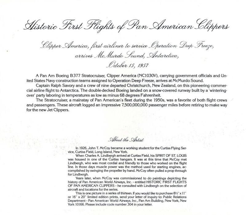 A Pan American World Airways First Class Menu.. Pan American Clipper America, first airliner to service Operation Deep Freeze, arrives McMurdo Sound, Antarctica, October 15, 1957, a Boeing B377. The cover print is by John T McCoy. On the inside cover is information on the Boeing B377 Airplane and the artist. In very fine condition, measures about 11" x 8 1/2" when closed. In this menu cover is a 4 page menu in French and English. Has a page of Aperitifs and other drinks and a page of Cold Collation and International Coffees in addition to the menu page shown in the scan, Dated 1984. A Historic First Flights of Pan American Clippers Menu