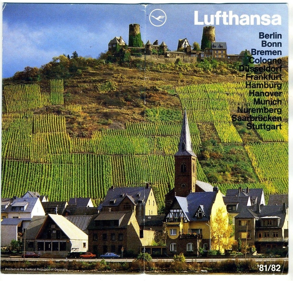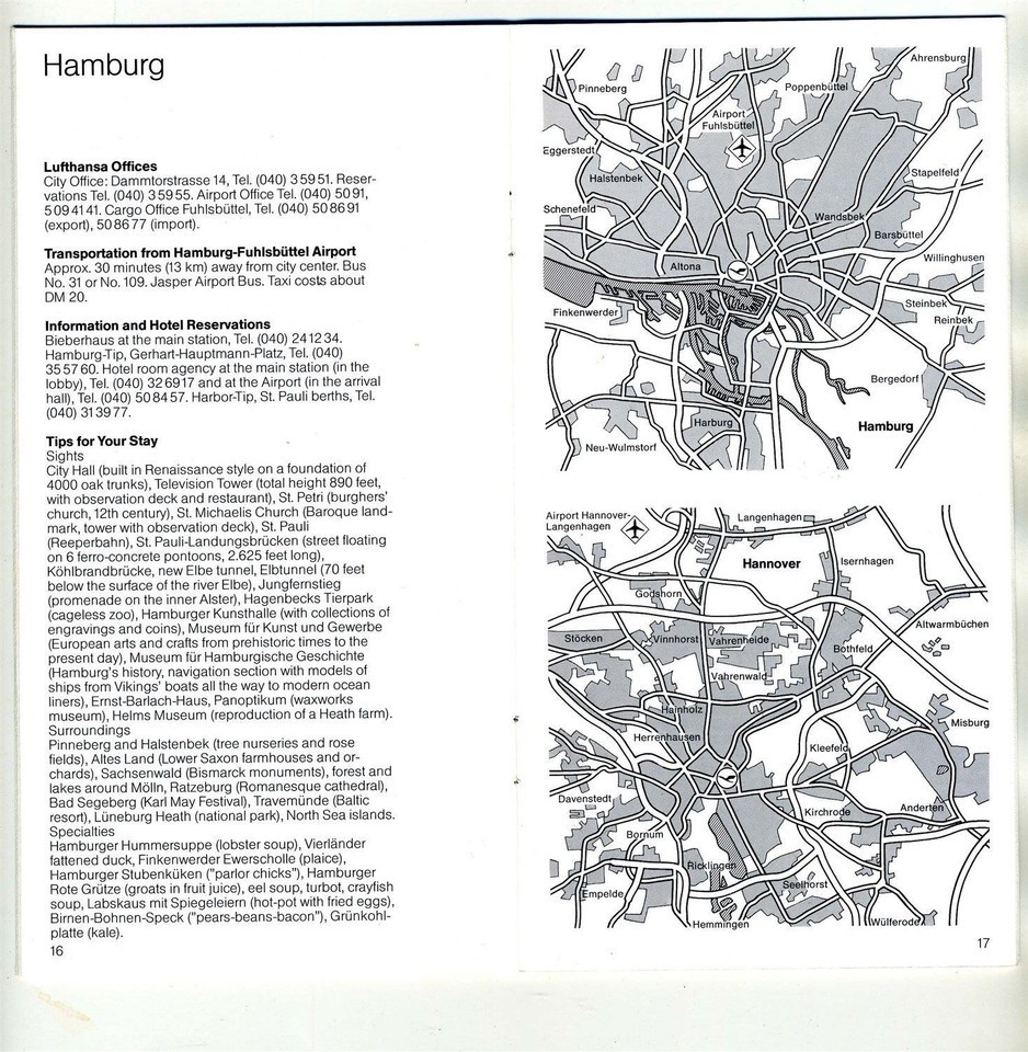 A 26 page booklet published by Lufthansa German Airline of City Maps. In English. For 1981 - 1982s and includes the cities of Bonn, Berlin, Bremen, Dรผsseldorf, Hamburg, Hanover, Frankfurt, Cologne, Munich, Stuttgart and Nuremberg. Has information on each city and a map of the main business district.