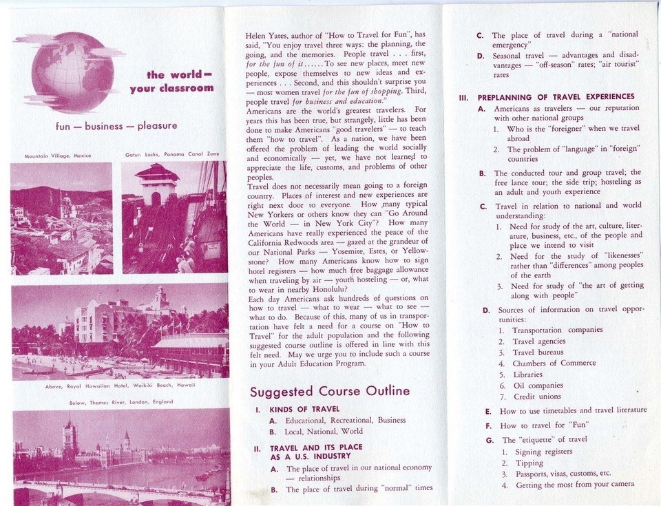 There are 3 items in this lot from the United Airlines School and College Service. There is an illustrated 8 panel fold out brochure for the school year 1953-1954. A 6 panel fold out brochure on How to Travel and a single page short cover letter. Due to the size limitations of my scanner, the entire item may not show in some of the scans.