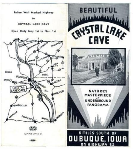 an 8 section fold out brochure filled with photos and information on beautiful Crystal Lake Cave, 6 miles South of Dubuque, Iowa. In very good condition, circa 1950's. Includes area map, cave history and more.