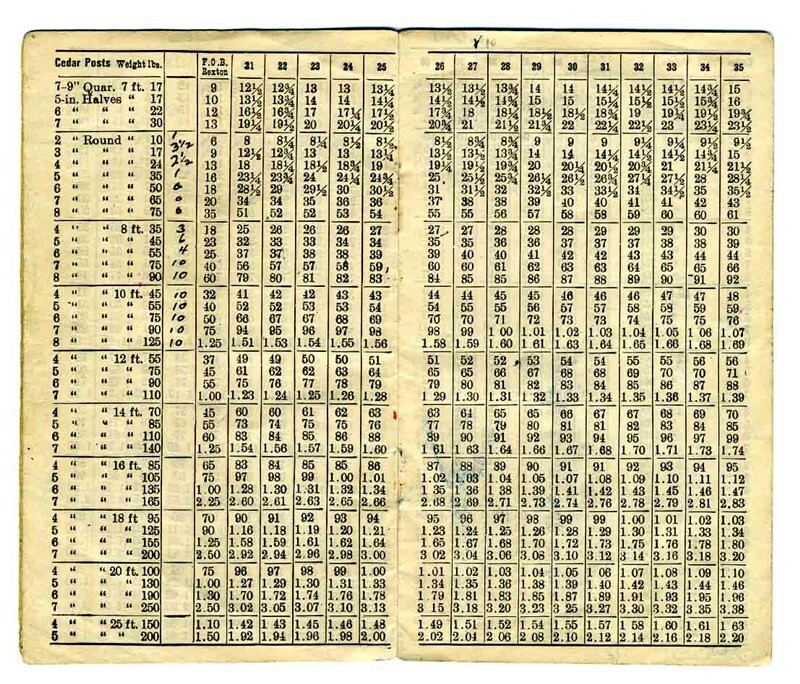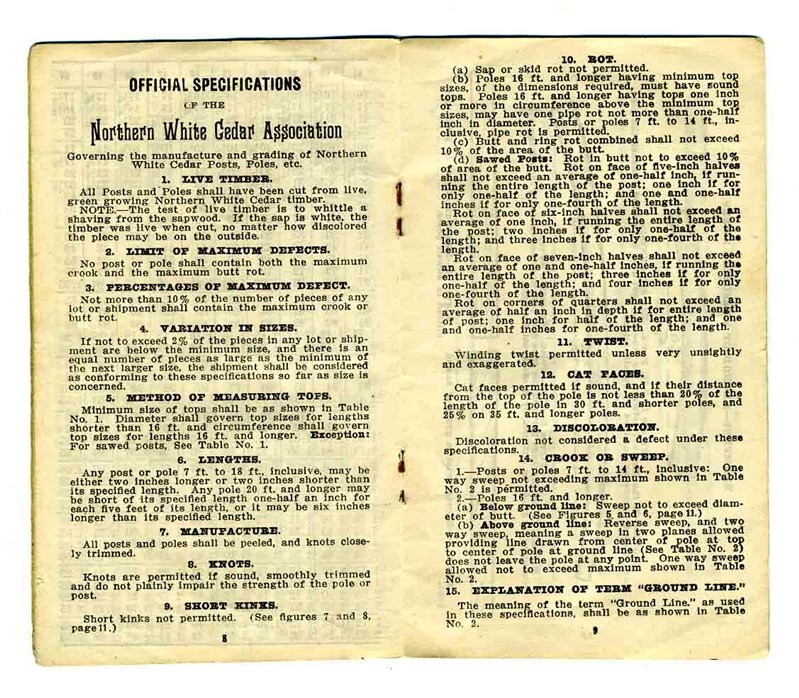 A 16 page pocket sized booklet from 1911. Cedar Post Price List Booklet with Delivered Prices, Specifications, weights and Measures. From the T M Partridge Lumber Co in Minneapolis Minnesota. With the official Specifications of the Northern White Cedar Association.