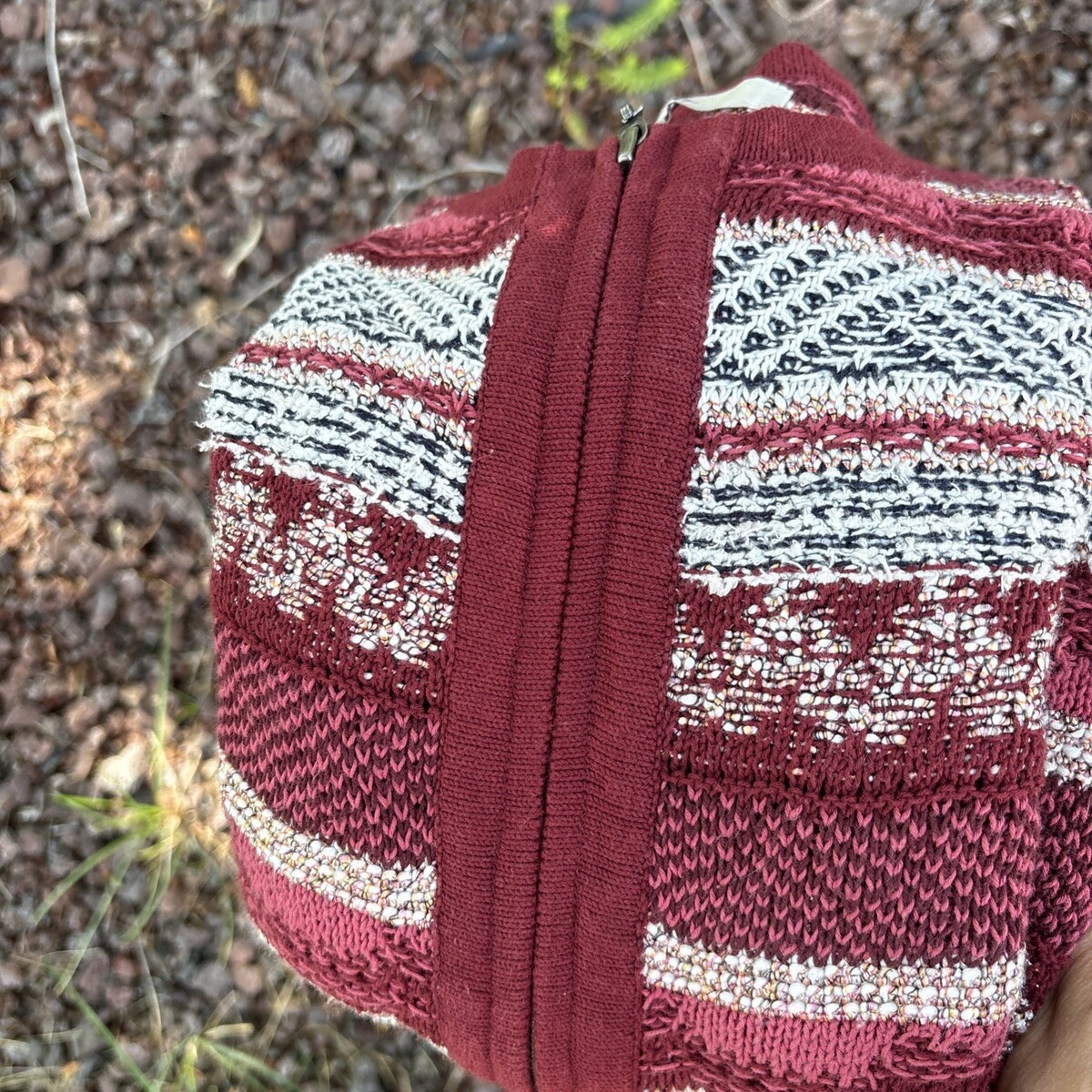 Beautiful textural knitting in rust/burgundy/rose with some slightly metallic threads throughout