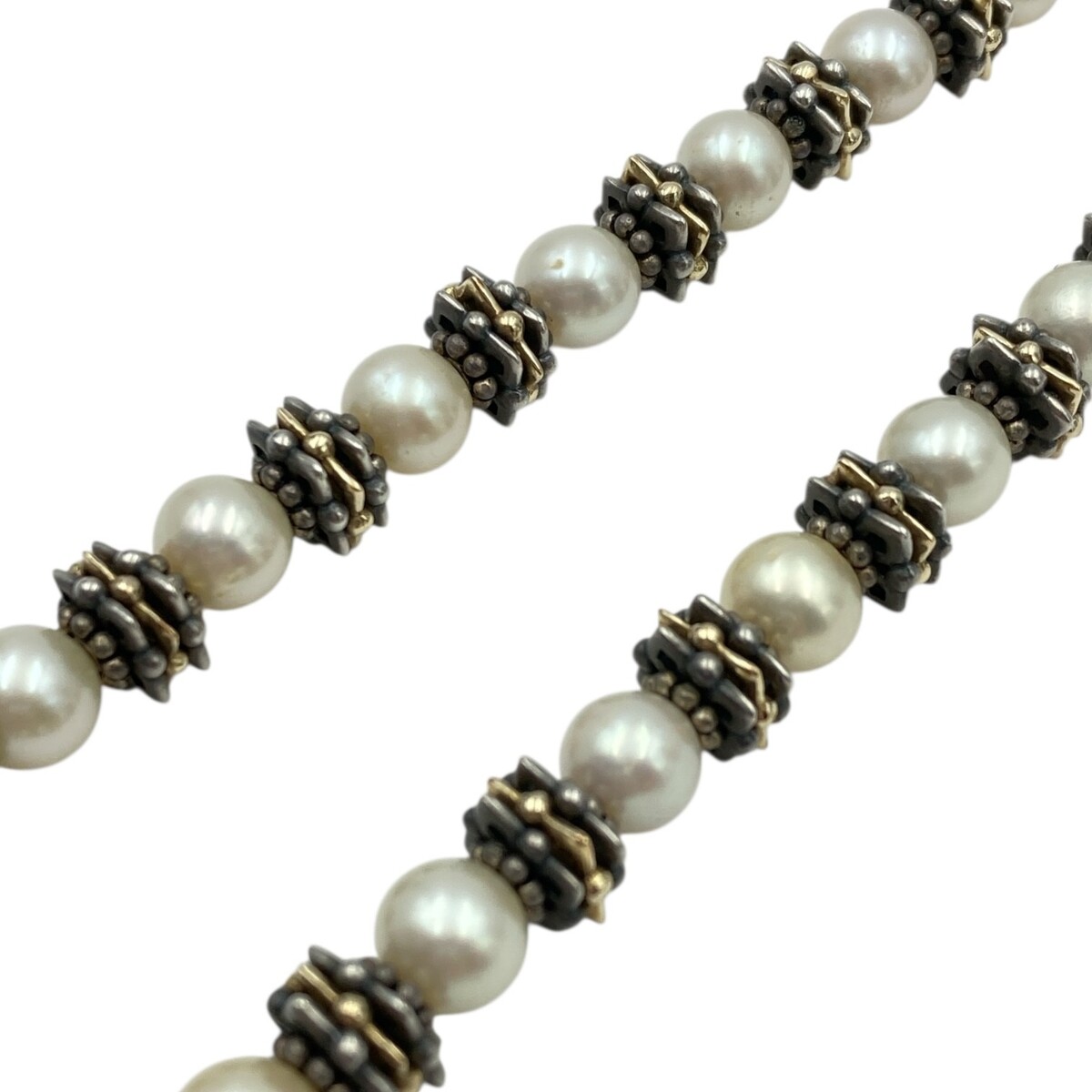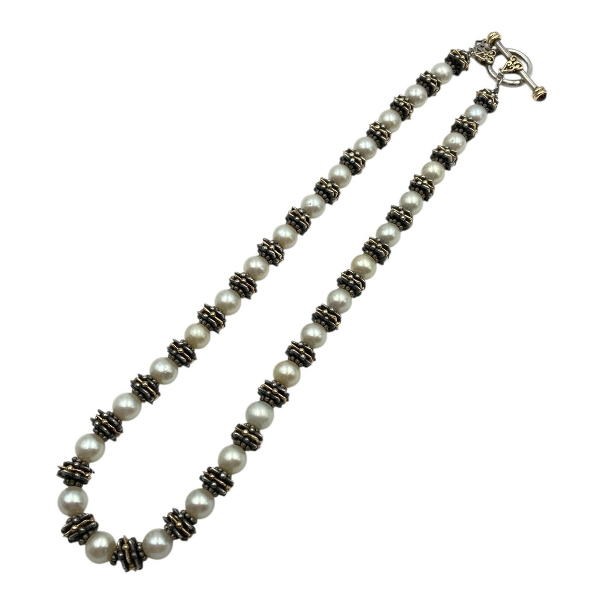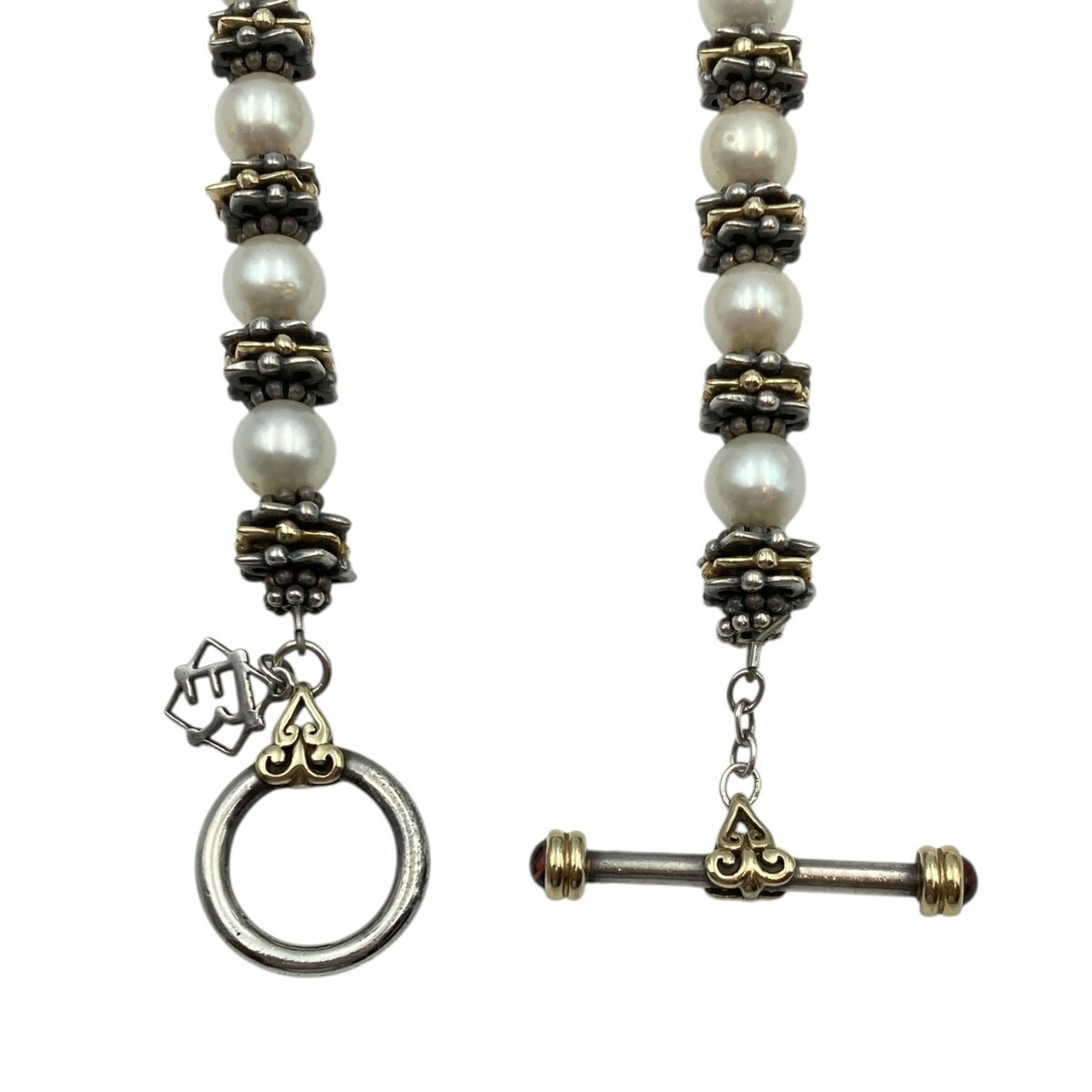 Description: This pre-owned Elyse Ryan necklace is crafted in sterling silver with 18K yellow gold accents, offering a refined balance of elegance and substance. It features luminous cultured pearls, complemented by a discreet garnet cabochon detail set exclusively at the end of the toggle closure. Measuring 16 inches in length and weighing 62.7 grams, this piece delivers both presence and timeless sophistication.