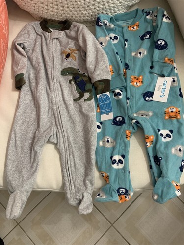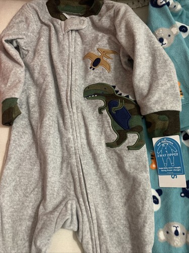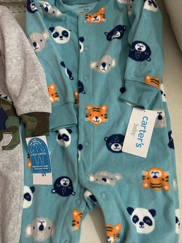 The product is a 2-piece baby boy animal print fleece footie pajama set in size 6 months. Made by Carter's, the set features a cute animal print pattern in multicolor with long sleeves and a zip closure. The fabric is cotton with fleece lining, making it suitable for all seasons. Easy to care for with machine washable instructions, this one-piece outfit is perfect for keeping your little one cozy and stylish while sleeping. New with tag. Dinosaur gray with Camo print neck and wrist area. Zip up. The blue koala, bear and tiger animal print is snap up buttons. A blue green color. Both warm and cozy.