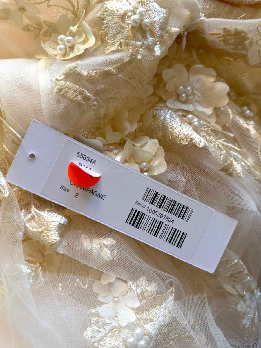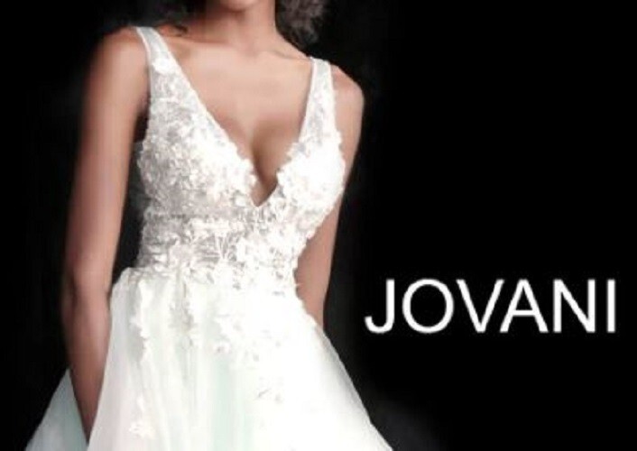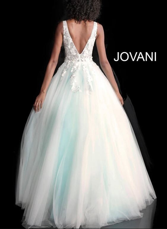 This stunning Jovani 55634 gown features an elegant off?white sheer overlay adorned with delicate floral appliques. The V?neck bodice is beautifully detailed, offering a romantic and feminine look, while the flowing tulle skirt creates graceful movement with every step. The champagne underlay adds a soft, warm glow that enhances the gown?s intricate embellishments.