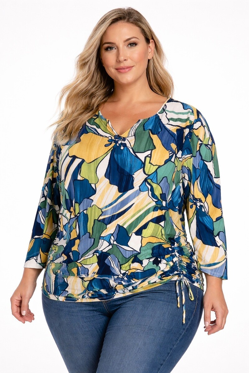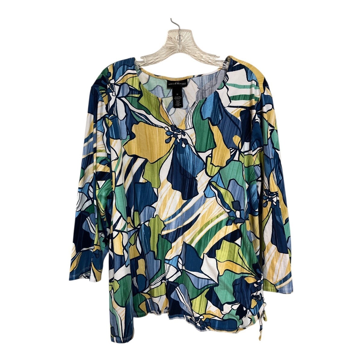 Alfred Dunner Studio women?s long sleeve top featuring a bold abstract floral print in blue, green, yellow, and white. Designed with a flattering V-neckline and a ruched side drawstring detail that allows for adjustable shaping and drape. Soft, lightweight knit fabric with comfortable stretch, perfect for casual wear or layering.