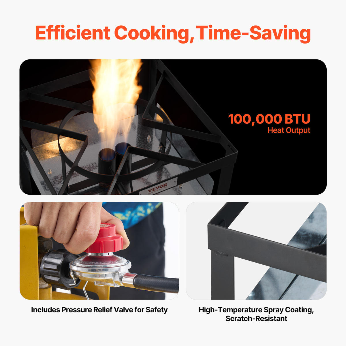 100,000 BTU Heat Output: The burner delivers up to 100,000 BTU of heat output, helping cook various foods quickly and evenly. The seafood boiler set comes with a CSA-certified pressure relief valve accessory that automatically regulates pressure, keeping the system stable for maximum safety.