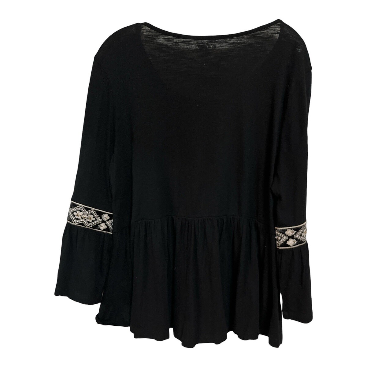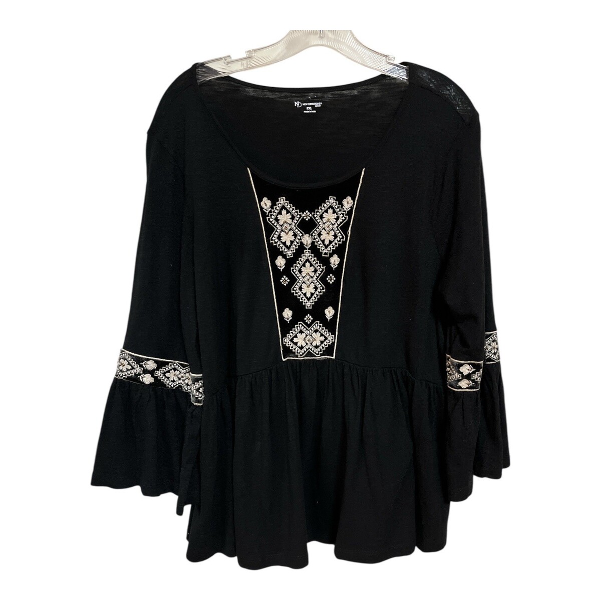 New Directions Petite PXL Black Embroidered Tunic Top Boho Long Sleeve