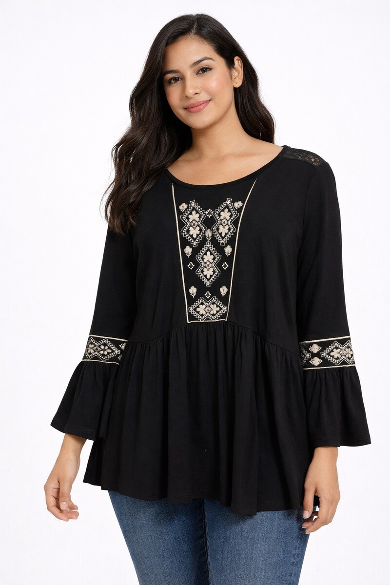 New Directions petite tunic top in black featuring intricate white embroidered geometric and floral detailing on the front panel and sleeve bands. The embroidery is set against a **soft velvet-like fabric** at the yoke and sleeve accents, adding rich texture and subtle contrast. Designed with a scoop neckline and a flowy, empire-style silhouette for a comfortable, flattering fit. Lightweight body fabric with a soft drape, perfect for casual wear, boho styling, or layering.