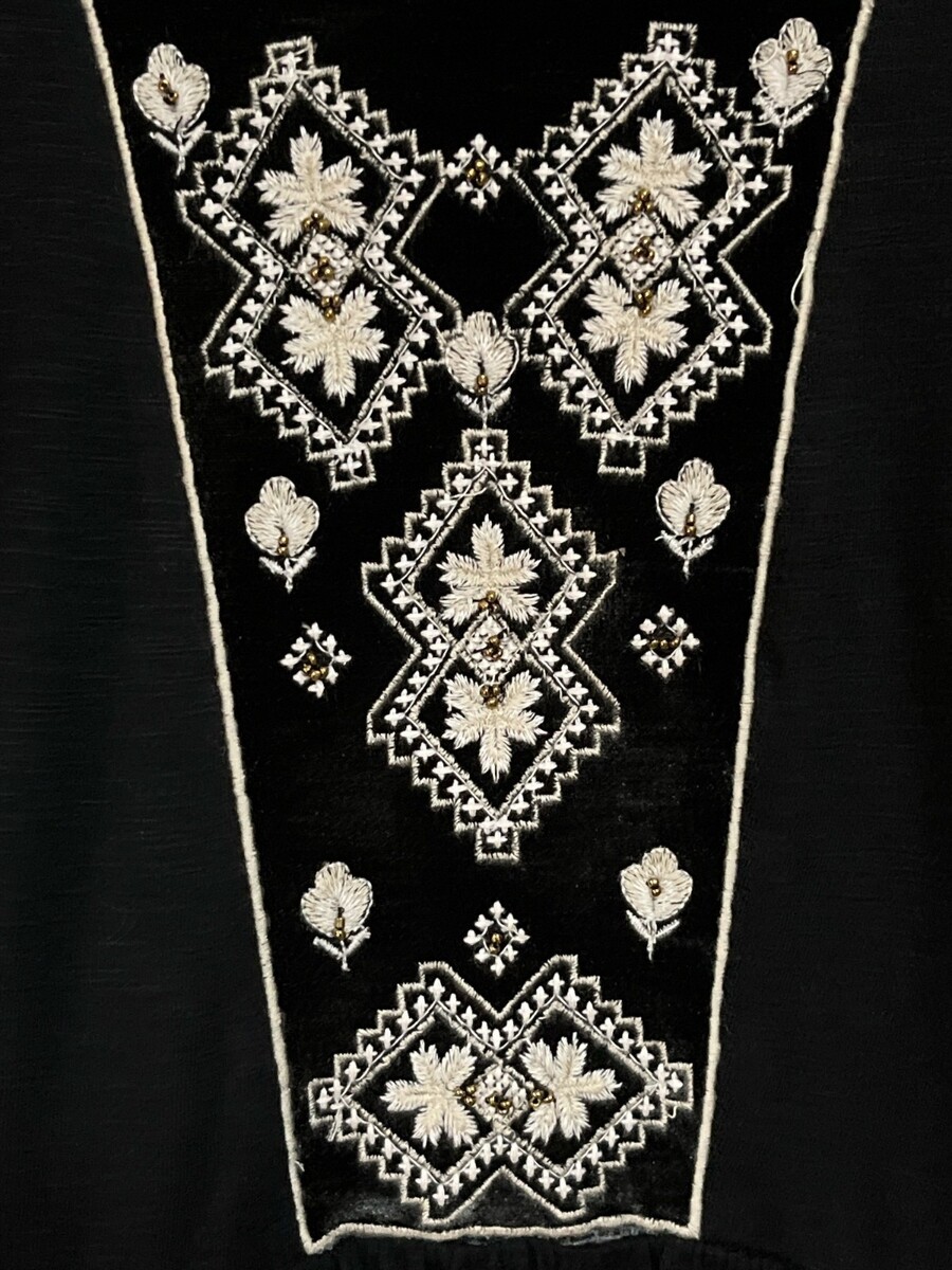 Velvet-like fabric bands at sleeves behind embroidery