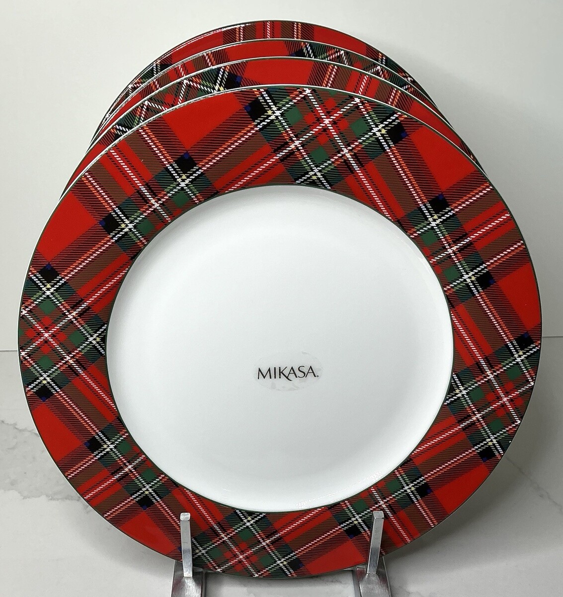 4 Mikasa Dinner Plates Bone China Christmas Tartan Plaid Red 11” New
