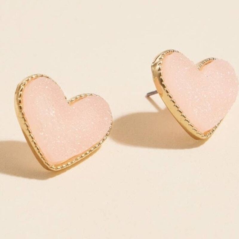 Add effortless glamour to your everyday look with these heart druzy stone stud earrings featuring natural crystalline sparkle. The delicate heart shape and shimmering pink druzy stones catch the light beautifully, creating an eye-catching focal point that transitions seamlessly from day to night.