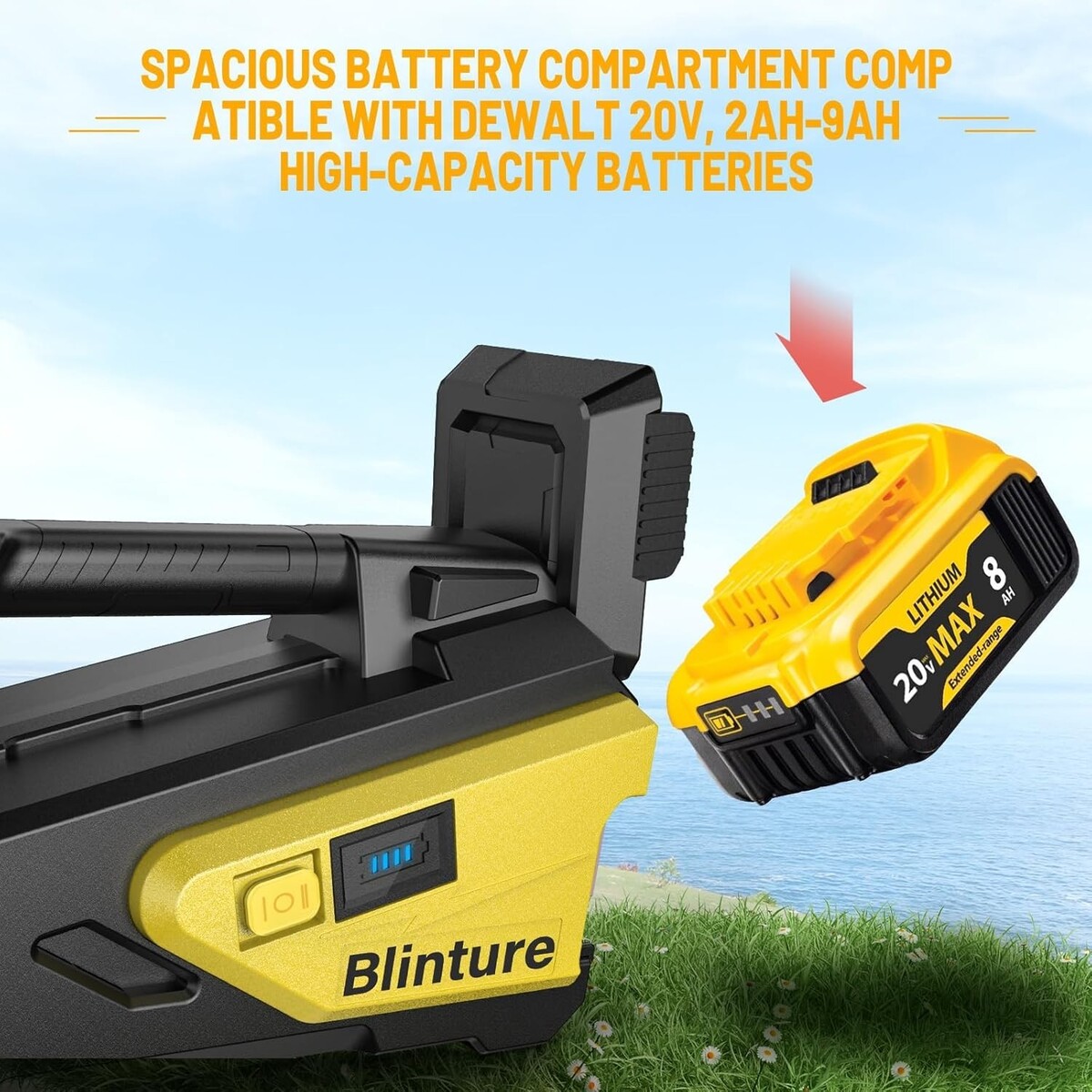 ?Large Battery Compartment and Extended Battery Life?Blinture's specially enlarged battery compartment accommodates up to 9Ah DeWalt high-capacity batteries, offering a battery life of up to 4 hours. In contrast, other wireless water pumps support only 2Ah batteries, with a battery life of approximately 30 minutes