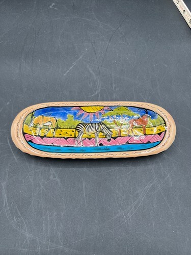 Add a touch of eclectic charm to your home decor with this beautiful oblong oval tray. Measuring 18 inches in length and 8 inches in width, this heavy, handmade ceramic piece features a glossy finish and an impressed backstamp. The glaze has a metallic antique bronzed look to it.