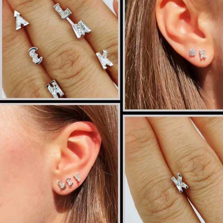 The earrings are made with high-quality materials like sterling silver or gold, with each letter cut in a sleek, modern style that emphasizes clean lines and a bold silhouette. The unique cutting technique creates light-catching facets, giving the earrings a subtle sparkle and depth without the need for diamonds.