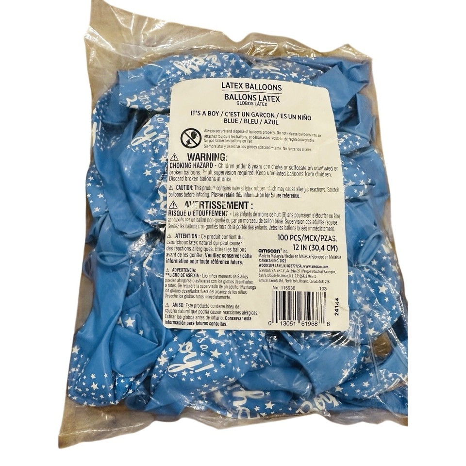 The product is a pack of 100 12" blue latex balloons featuring the text "It's a Boy" in a design suitable for a baby shower. The balloons come from the brand Amscan and are specifically designed for girls. These balloons are perfect for adding a special touch to a baby shower celebration.