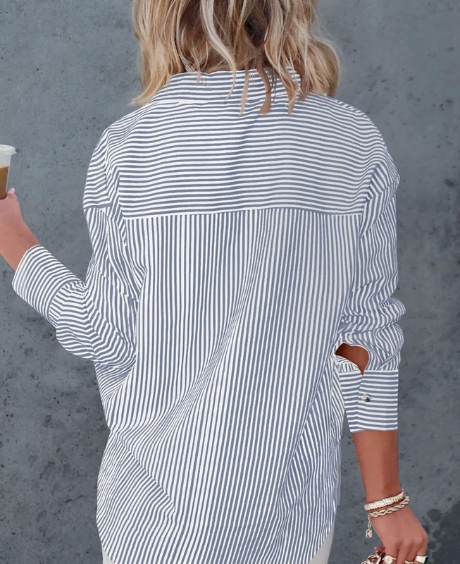 Womens Striped Button down Shirt Classic Long Sleeve Stylish Collared Top Grey,L