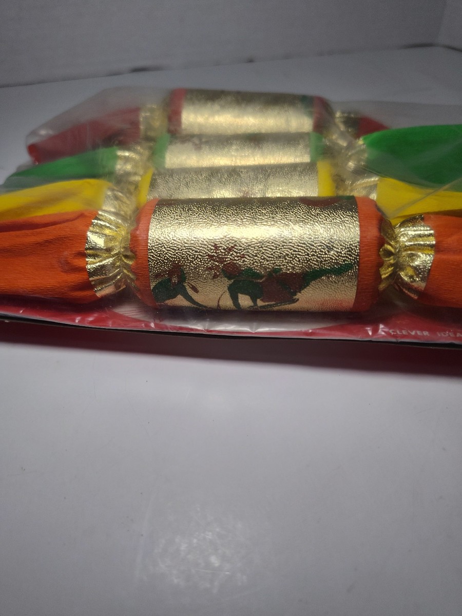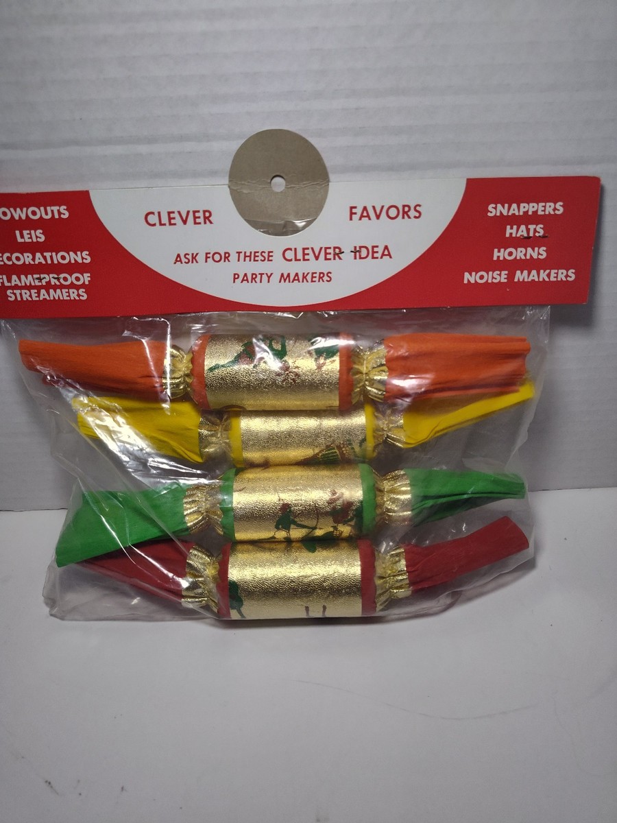 Vintage sealed package of 4 Decorated Snappers made by Clever Idea Co., Brooklyn, N.Y., originally sold for 29. These classic party favors were popular in the 1950s?60s and feature colorful crepe paper ends with gold foil wrappers decorated with cowboys and Indians. When pulled apart, the snappers make a popping sound ? similar to Christmas crackers.