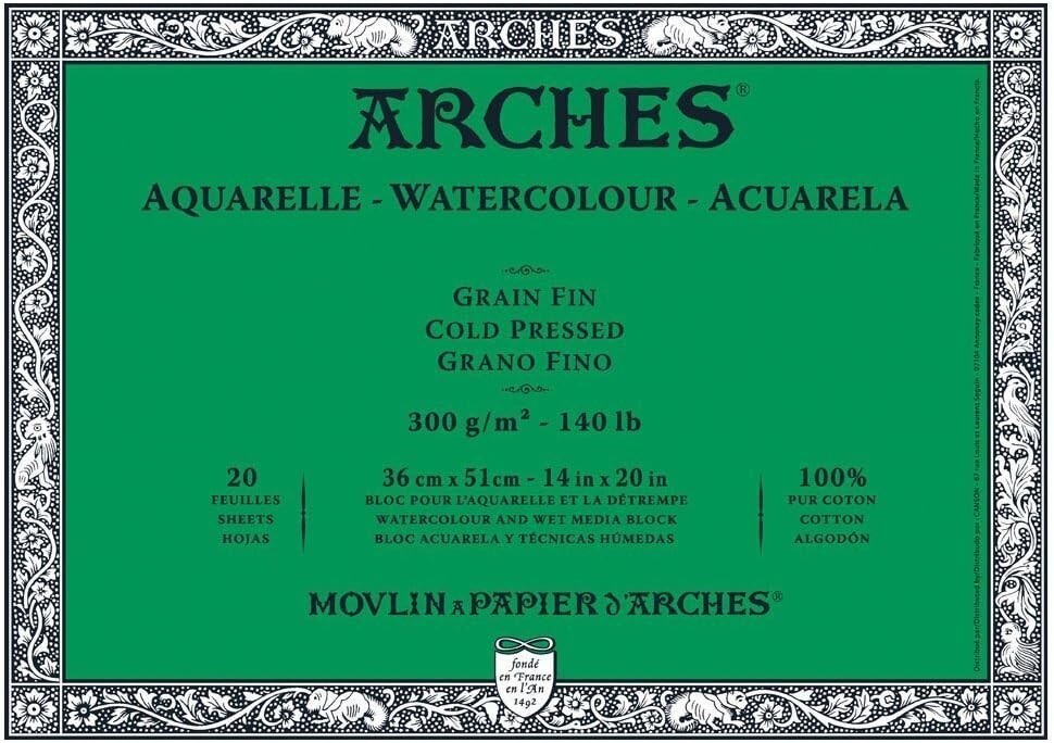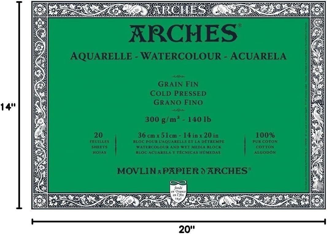Watercolor Blocks contain paper made with natural cotton fibers on a cylinder-mold machine. This artist-grade watercolor paper is great for watercolor, gouache, acrylic, and airbrushing. is made with a natural gelatin sizing. These blocks contain 20 sheets of natural white, acid free, 100% cotton paper, and are glued on all 4 sides. This block is 14"X20" cold press 140lb / 300g.