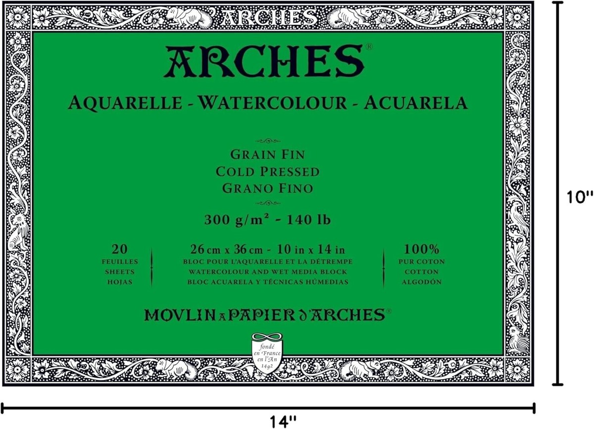 Arches Watercolor Block 10x14-inch Natural White 100% Cotton Paper - 20 Sheets of Arches Watercolor Paper 140 lb Cold Press - Arches Art Paper for Watercolor Gouache Ink Acrylic and More