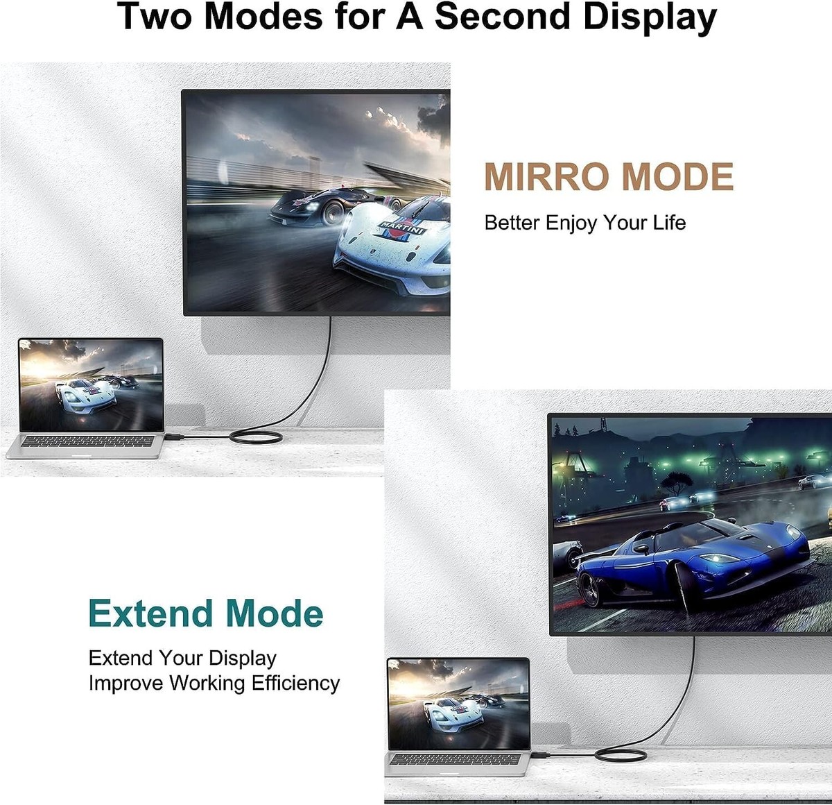?Two Modes?DP to HDMI cable support mirror mode makes your holiday photos and favorite films so much more interesting and enjoyable on the big screen, extended Mode you can double your workspace or enjoy a movie when doing some easy task.