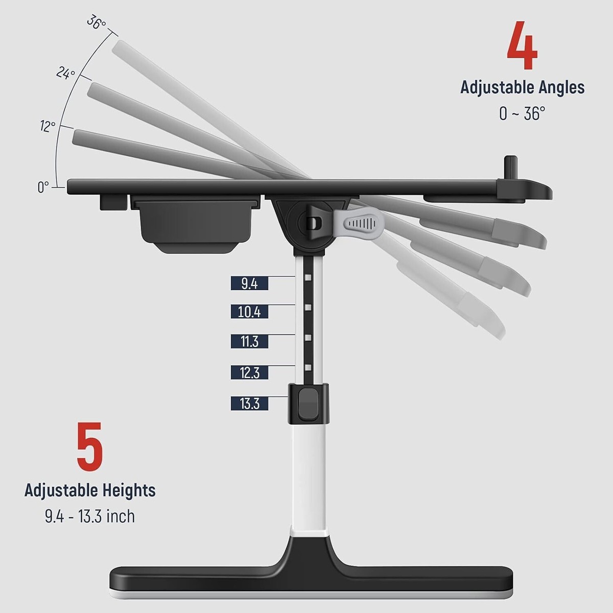 ?Adjustable Laptop Bed Table?: Two auto-lock buttons on each side can change in height easily, the legs can be set to 5 different heights (adjustable from " - "), in addition two clamps can be used to adjust 4 different angles (from 0-36).