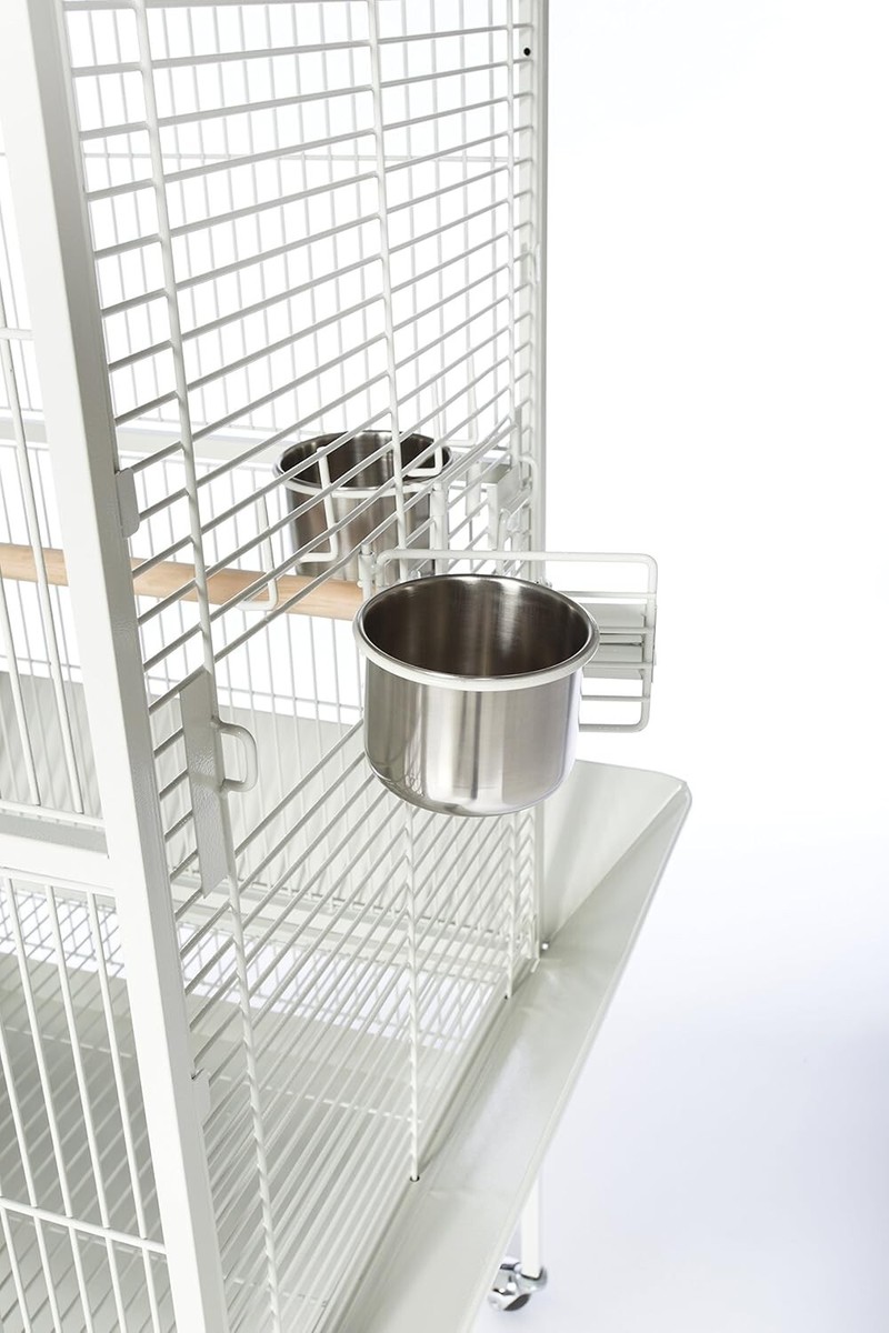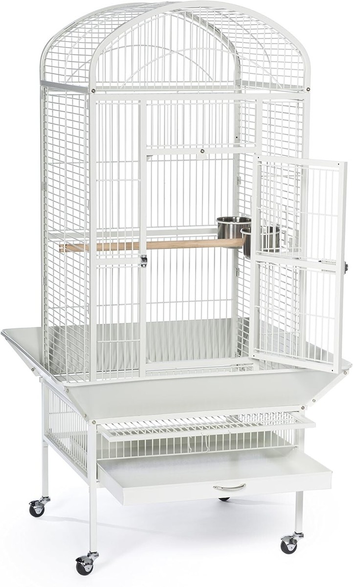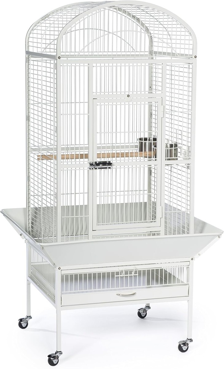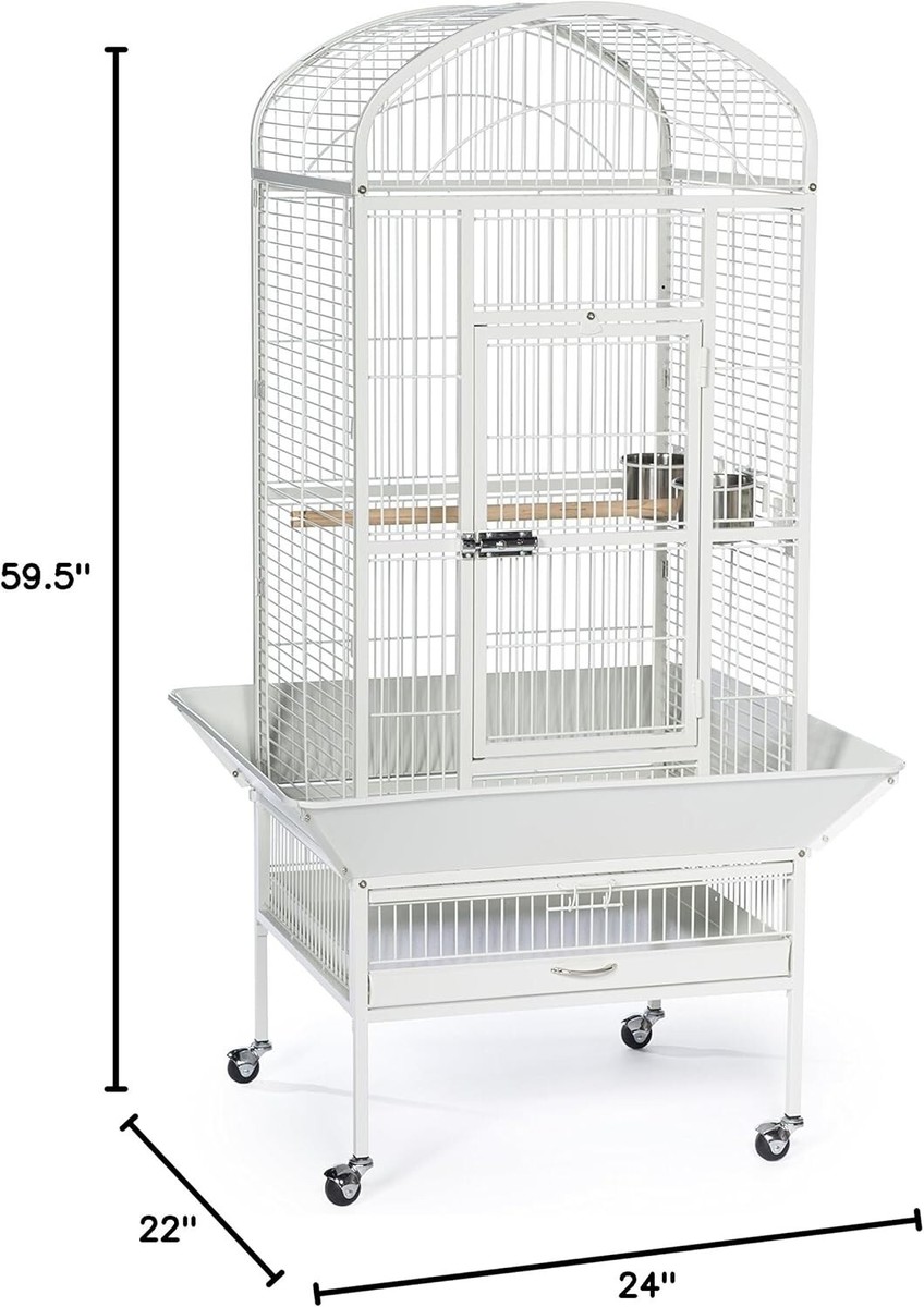 Medium Dome top Bird Cage Chalk White features a roomy and refined dome top roofline with extra space for hanging toys and letting your bird stretch its wings. Expertly engineered in the USA to be easily assembled and loaded with owner, and bird, friendly features, our wrought iron constructed cage offers quality craftsmanship at an affordable price. Rounded corner seed guards help control mess outside of the cage and are less likely to damage walls or catch on your clothing, seed guard measurements are 32 1/4" long and 30 1/4" wide. Both grille and debris tray are removable for ease of cleaning and the integrated cage stand sits on sturdy, easy rolling casters. The large front access door measures 11 3/4'' long by 21 3/4" high and closes securely with a push button lock plus a wind-bell lock to prevent any escape artists from pushing the door open. Included with this cage are 2 stainless steel 24 oz. food/water cups, which lock into place within the 4" long by 6" high cup doors and a generously sized 7/8" wooden perch. Finished with a durable and elegant chalk white powder coating, Prevue cages undergo independent lab testing and conform to the highest levels of pet safety. Medium Dome top Bird Cage Chalk White is constructed from 9 10 gauge wire and measures 24" long, 22" wide and 59 1/2'' high with 3/4" wire spacing.