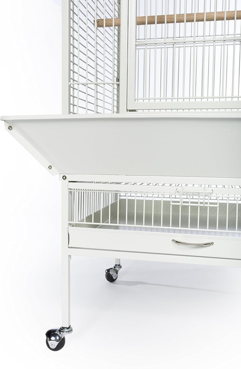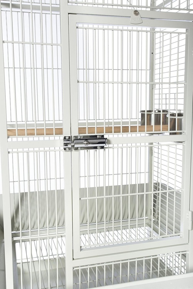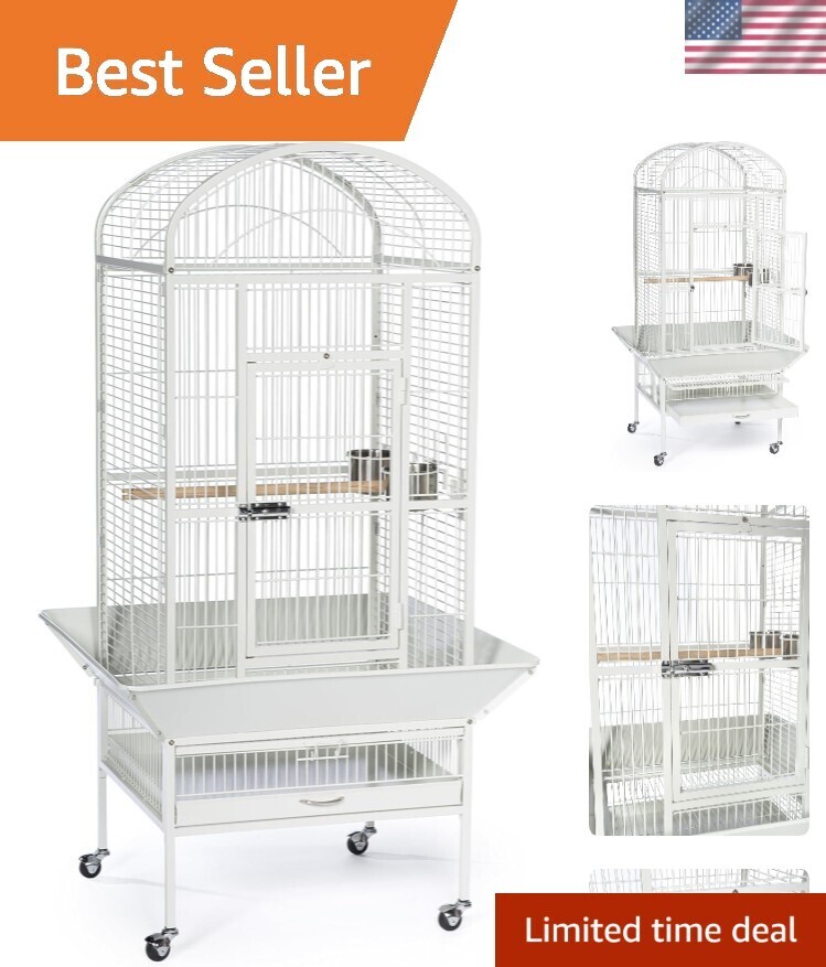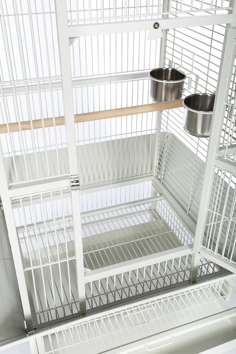 Medium Dome top Bird Cage Chalk White features a roomy and refined dome top roofline with extra space for hanging toys and letting your bird stretch its wings. Expertly engineered in the USA to be easily assembled and loaded with owner, and bird, friendly features, our wrought iron constructed cage offers quality craftsmanship at an affordable price. Rounded corner seed guards help control mess outside of the cage and are less likely to damage walls or catch on your clothing, seed guard measurements are 32 1/4" long and 30 1/4" wide. Both grille and debris tray are removable for ease of cleaning and the integrated cage stand sits on sturdy, easy rolling casters. The large front access door measures 11 3/4'' long by 21 3/4" high and closes securely with a push button lock plus a wind-bell lock to prevent any escape artists from pushing the door open. Included with this cage are 2 stainless steel 24 oz. food/water cups, which lock into place within the 4" long by 6" high cup doors and a generously sized 7/8" wooden perch. Finished with a durable and elegant chalk white powder coating, Prevue cages undergo independent lab testing and conform to the highest levels of pet safety. Medium Dome top Bird Cage Chalk White is constructed from 9 10 gauge wire and measures 24" long, 22" wide and 59 1/2'' high with 3/4" wire spacing.
