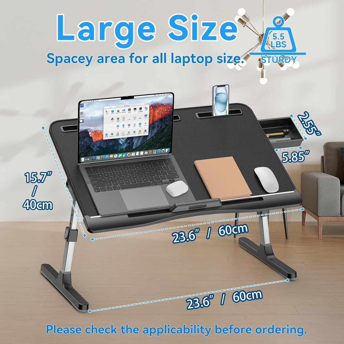 X-LARGE WIDE DESIGN - Large desktop ( can meet your various needs, easily accommodate laptop, tablet, mouse at the same. A storage drawer on the right side of the laptop stand for bed is convenient to hold small items such as mice, USB cables, tape, pens, glasses, etc.