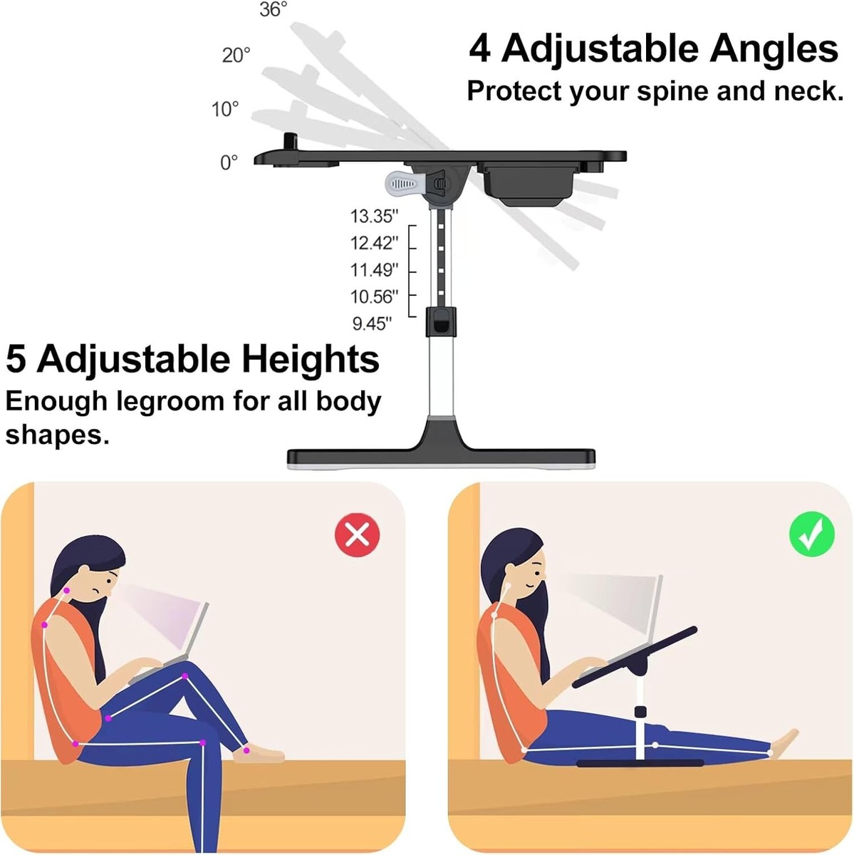 ADJUSTABLE HEIGHT TILT - The laptop desk legs can be set to 5 different heights ( " ") to ensure enough leg room for all body shapes to sit as preferences. The desktop can be tilted at 4 different angles (0- 36), relieving stress on the neck and spine.