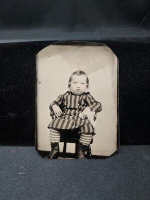 Antique 1800s Victorian Era Tintype Photo Chubby Kid Child In Striped Clothes. Condition is Used. Shipped with USPS Ground Advantage.