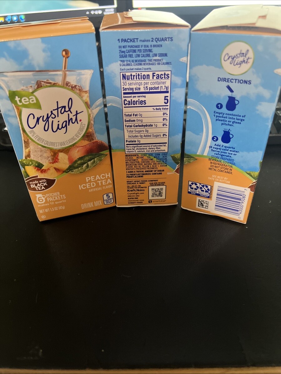 (3) boxes of Crystal Light peach iced tea made with black tea Powdered Drink Mix 6 Count Pitcher Packet