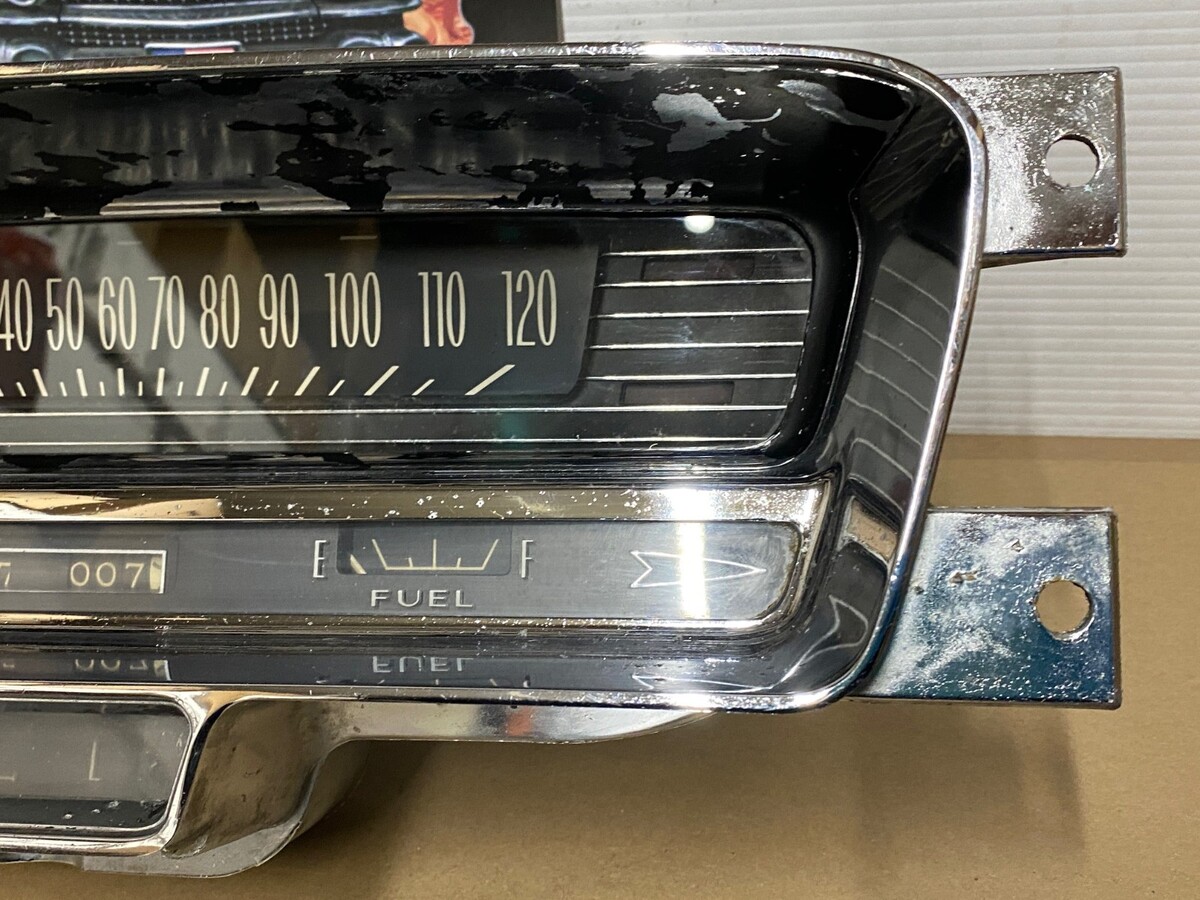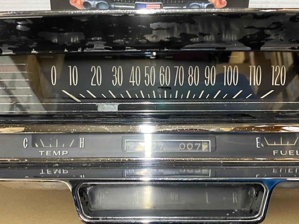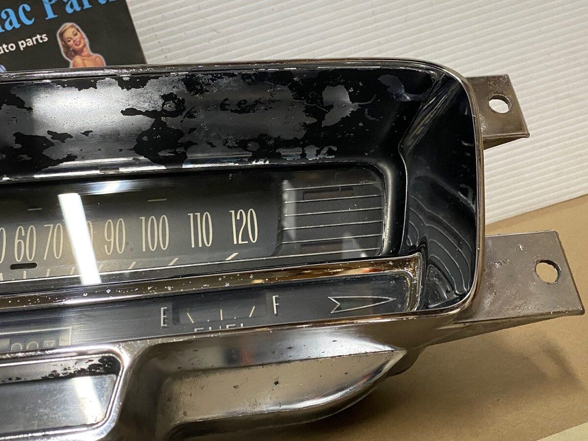 This OEM instrument cluster is in driver quality condition. Chrome has a decent shine, but does have some pitting. Speedometer was bench tested with a cable and drill and is in good working condition (see video), and the odometer and tripometer are in good working condition, but it is 60 years old, so may till need some service, it was not driven on highway, etc. Gauges and printed circuit board are untested. Please view the