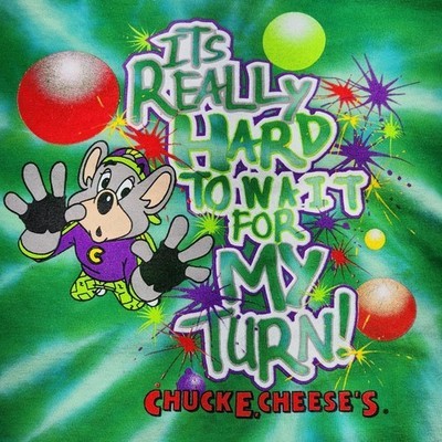 Kids Chuck E Cheese Tie Dye Green T Shirt It's Hard to wait for my turn VTG L 12
