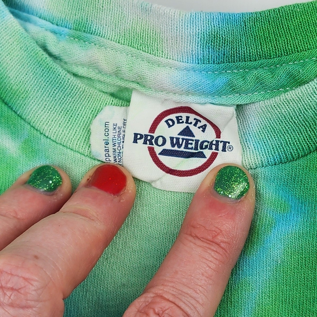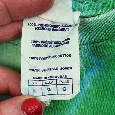 Keywords: Chuck E Cheese, tie dye, green, youth, large, kids, tshirt, character, cartoon, summer, casual, playwear, graphic tee, retro, vintage, Y2K fashion, nostalgic, nostalgic