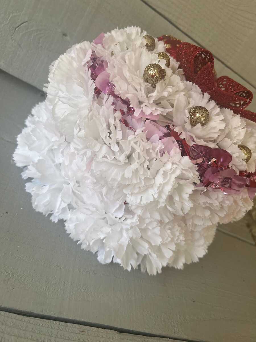 This heart / Valentines cake is for grave decoration. This 12” round diameter styrofoam cake has been covered in white carnations with heart ribbon separating the two layers of the cake, the top has a ridge of heart ribbon to serve as the trimming, a large red/gold heart ornament , gold glitter cherries , and a glitter red bow.