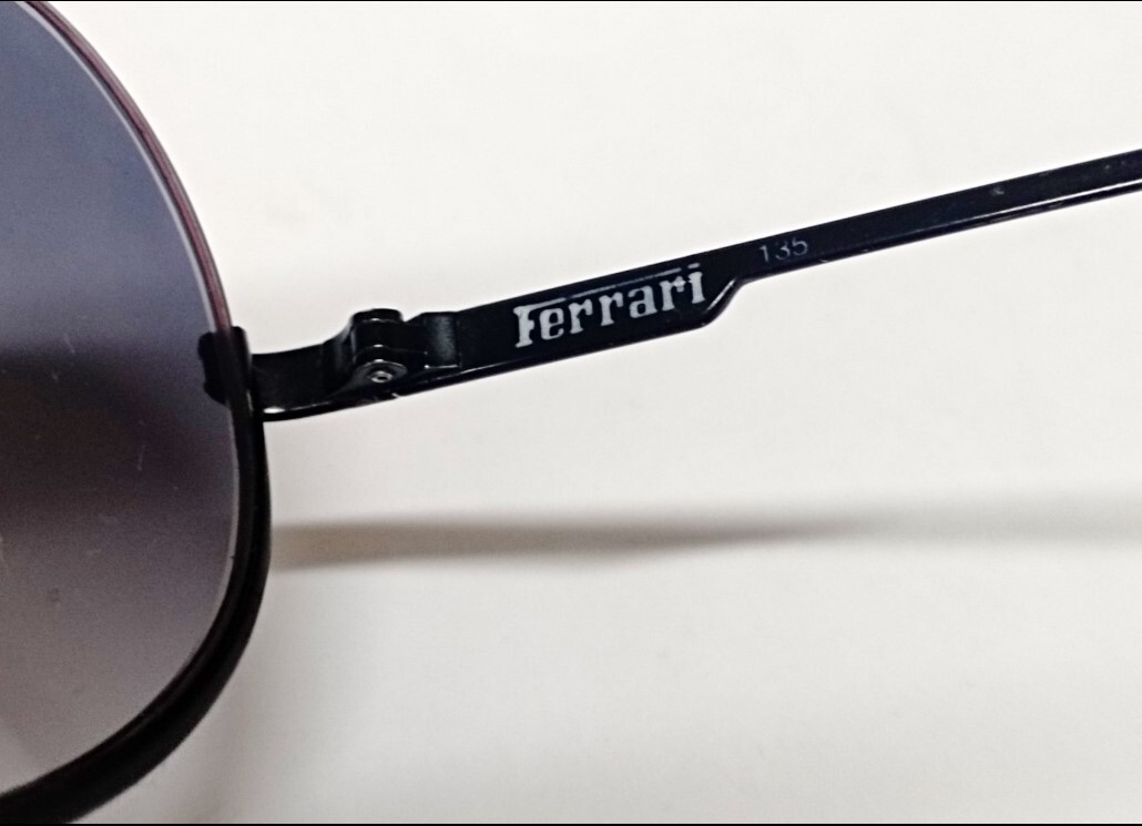 The black metal frame features distinctive horizontal front lines with a subtle “Ferrari” signature. The lenses are gradient teardrop-shaped, giving the sunglasses a refined yet dynamic character.