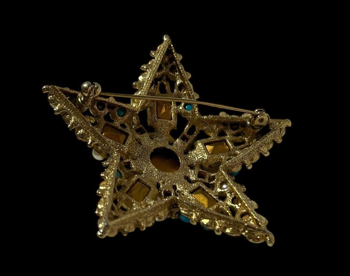 Vintage Unsigned Multicolor Rhinestone Star Brooch Goldtone Metal Faux Pearl Pin