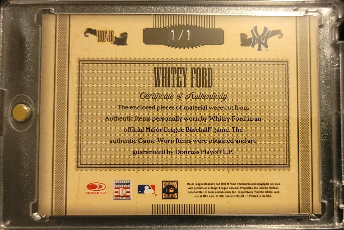 This whitey Ford Hall of Fame Gold 1/1 timeless treasure Induction by Donruss features authentic Game worn game used Material, a pair of Jersey and Pants that were game worn game used Material worn by whitey ford in a official Major League Baseball game. Donruss provides a script certificate of authentication for the authentic game worn game used Materials as authentic game worn game used Material worn by whitey ford in a official Major League Baseball game. Donruss provides a script registration serial for Documentation of Manufacturers Publication Production Authentication recognition as authentic licensed product. Whitey Ford is the Greatest PitcHer in Major League Baseball History. Whitey Ford won the most world series championship in Major League Baseball History with numerous accolades including world series accolades. This 1/1 Gold timeless treasure from Donruss is the real ticket, a true Golden treasure timeless in value and in History. A 1/1 stapled with Donruss script Certificate of authentication. For wealth this 1/1 is a must. An ioNs lovers choice.