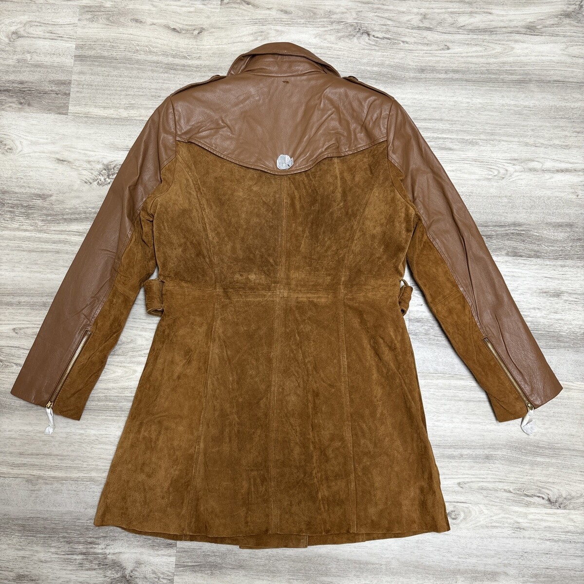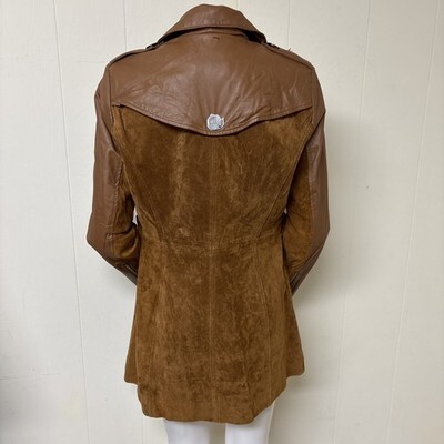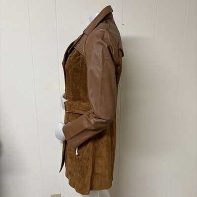Super stylish suede and leather trench coat. Y2K does the 70s chic double-breasted front, functional belt, dramatic contrast piping along the collar and down the front. It?s a statement piece perfect for all year long into the future!