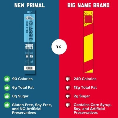 Dated 2/19/2026 ? GRASS FED BEEF STICK: Classic grass fed beef stick mixed with onion, white and black peppers, ginger, and lemon peel formed into a delicious easy to eat stick that?s perfect for convenient snacking at home or on the go. This keto snack pack contains 20 - 1oz sticks. ? KETO, GLUTEN FREE SUGAR FREE: Top 8 allergen friendly! Our meat sticks are naturally sweetened with pineapple juice and honey, made with 0g of sugar, Whole30 approved, paleo, keto, gluten free, and 100% grass-fed beef raised without added hormones or the use of antibiotics. ? 8G PROTEIN PER SERVING: The New Primal beef sticks are the perfect high protein snacks, that are portable and easy to eat. Feed your inner carnivore - Each grass fed meat stick has 8g of protein and just 90 calories per stick. ? HEALTHY SNACKS FOR ON THE GO: Our healthy snacks for adults are great for snacking anytime and anywhere, whether you're at the office, at school, traveling, camping, backpacking, running errands, or relaxing at home. These mess free individually wrapped snacks are easy to eat on the go compared to original beef jerky or other meat snacks! ? THE NEW PRIMAL: Try our full lineup of convenient, high protein, low sugar and low carb protein snacks. Pack crave-able flavors like Spicy Beef, Buffalo Chicken, Lightly Peppered Turkey and Cilantro Lime Turkey. Delicious, on-the-go snacking has never been easier!