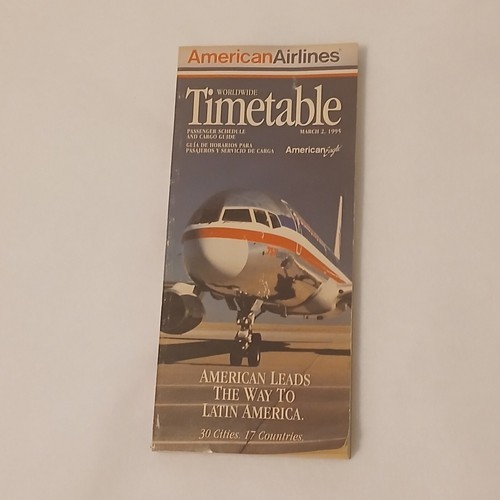 This listing is for a single American Airlines Timetable booklet. This timetable was effective on March 2, 1995. It features passenger flight schedules, seat maps, and cargo guides. The cover is clean with minor wear. The booklet is complete. There are 360 pages. There are no missing or torn pages. The pages are clean.